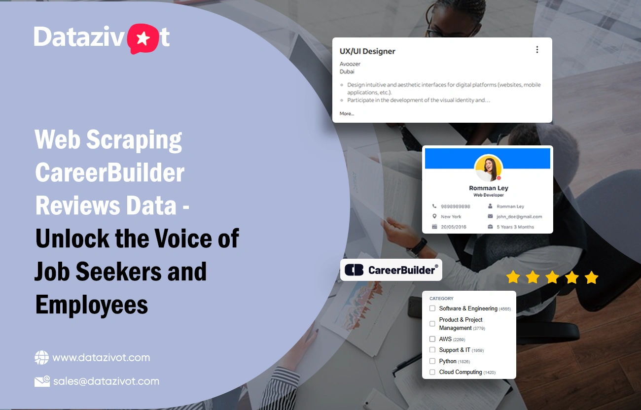 At Datazivot, we deliver precise and reliable Web Scraping Job Posting Reviews Data to help you uncover genuine insights from job seekers and employees. Our expert CareerBuilder reviews data scraping services enable you to scrape CareerBuilder reviews data efficiently for market analysis, HR strategy, and reputation management. With our advanced CareerBuilder reviews data extractor, you get structured and scalable data tailored to your needs. Trust our robust CareerBuilder reviews scraper to capture real-time feedback and sentiment from CareerBuilder users. Choose Datazivot for accurate, secure, and high-performance review data solutions that give your organization a competitive advantage.